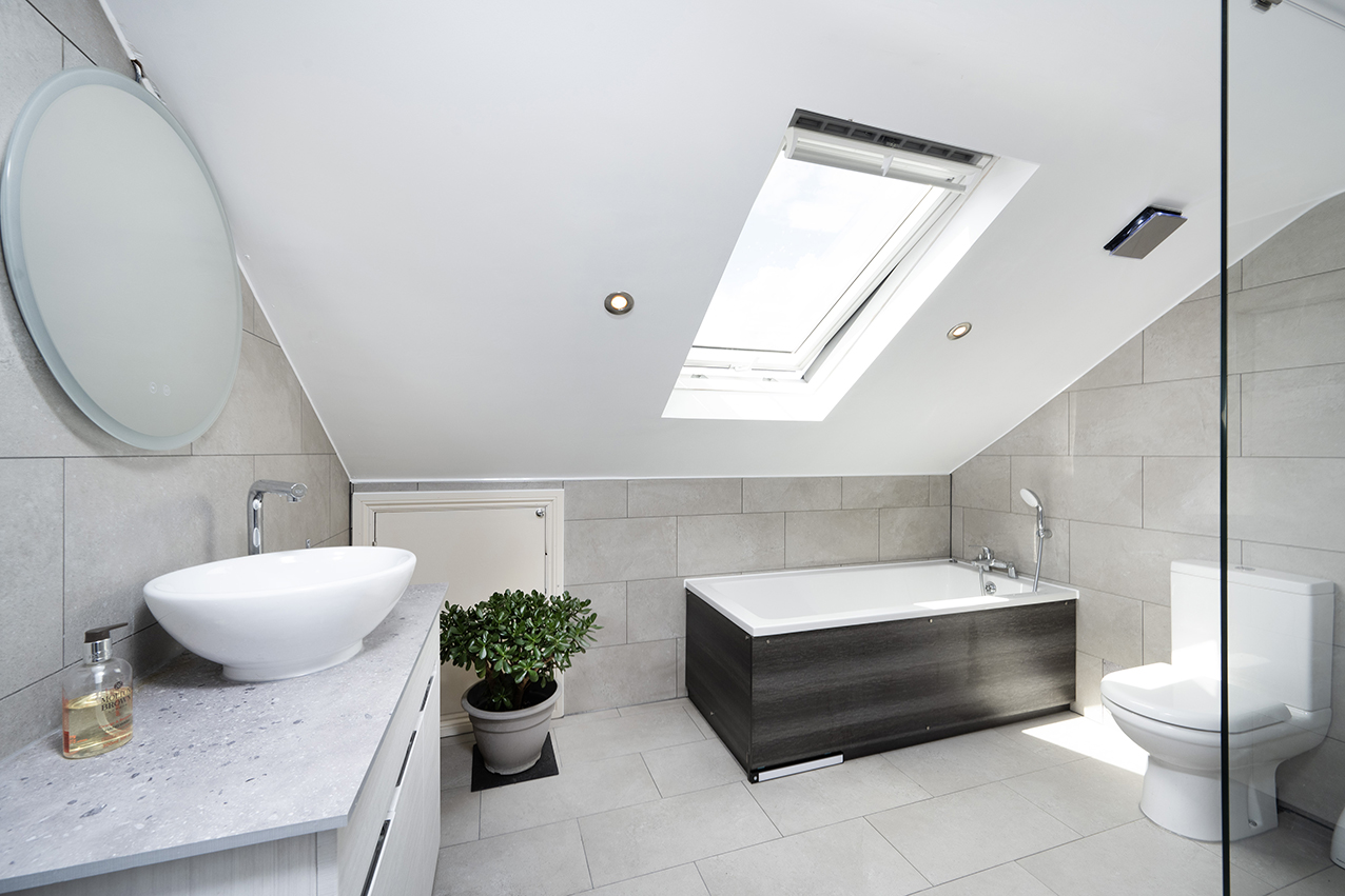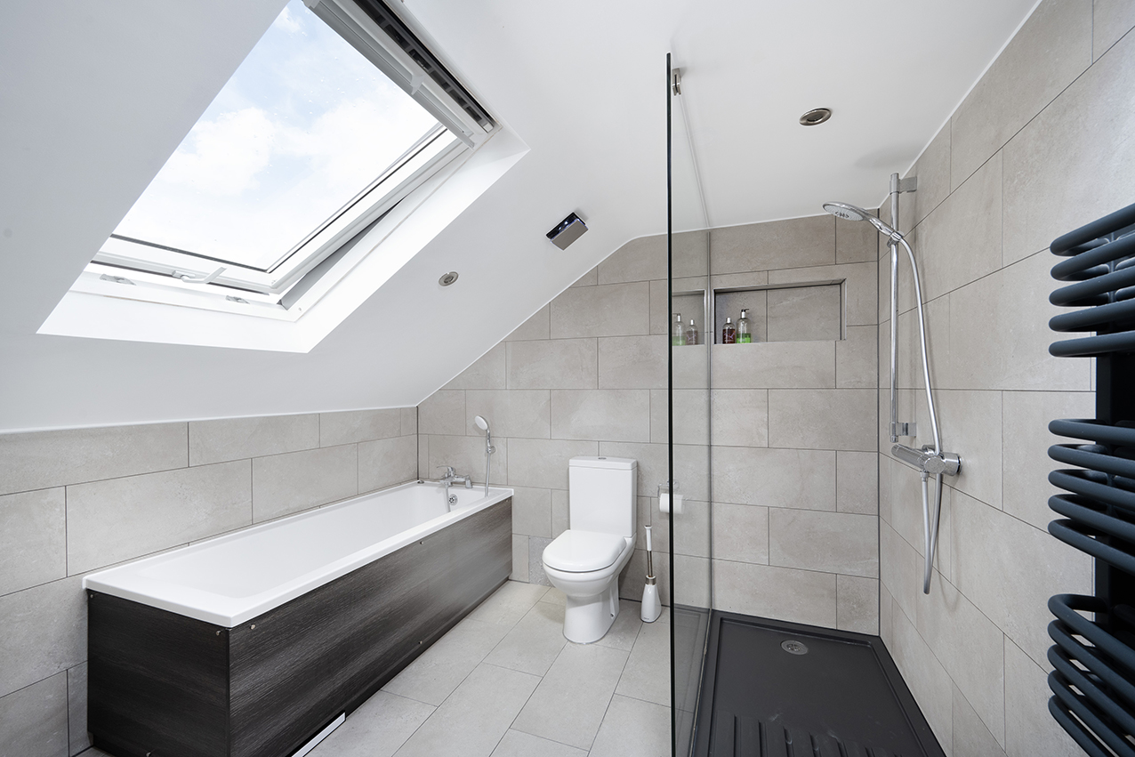 This stylish loft conversion in Barnet, designed and planned from start to finish by The Loft Converter, features a compact dormer that maximizes space within the existing roof area. The exterior is finished with elegant slate tiles and a sleek grey UPVC window, blending seamlessly with the property's aesthetic. Inside, the bathroom is finished with high-quality porcelain tiles, creating a luxurious wet room effect. Expertly designed with both functionality and style in mind, this conversion transforms unused space into a sophisticated and practical living area.